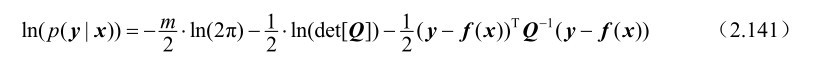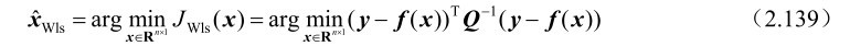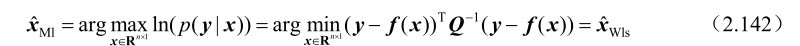 式中,加权矩阵Q -1 的作用是为了抑制观测误差的影响。根据式(2.139)可以证明加权最小二乘估计与最大似然估计的等价性,具体可见下述命题。