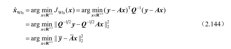 式中,A∈R m×n (n≤m)为列满秩矩阵。基于式(2.143)的加权最小二乘估计可以表示为