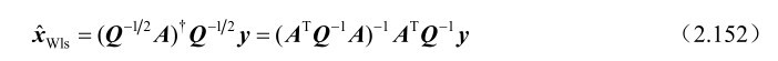 式中,y∈R m 1× 表示观测向量;x∈R n×1 (n≤m)表示待估计的未知参量;n∈R m×1 表示观测误差,这里假设它服从零均值的高斯分布,并且其方差矩阵为Q=E[nn T ]。基于式(2.138)可知加权最小二乘估计可以表示为