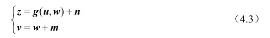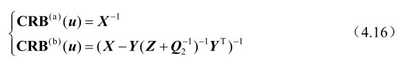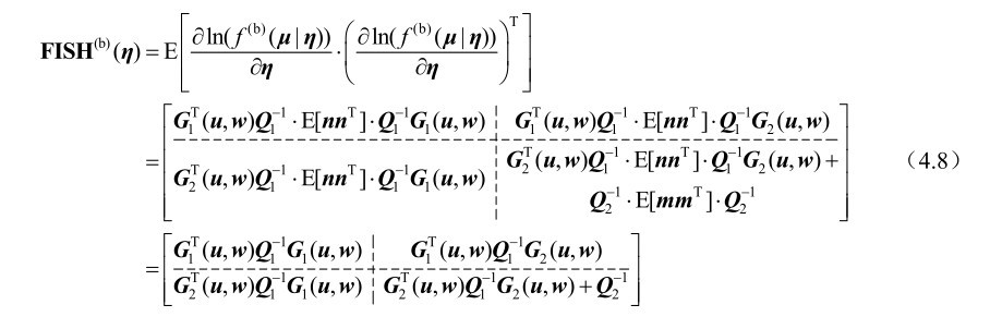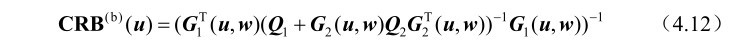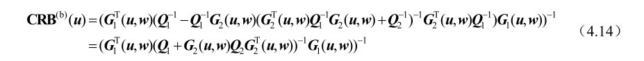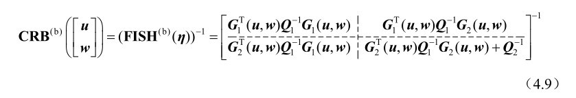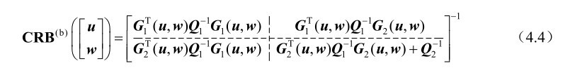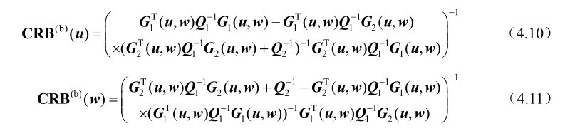 推论4.1: 基于式(4.3)中的观测模型,未知参量u和w联合估计方差的克拉美罗界矩阵可以分别表示为