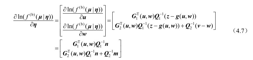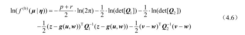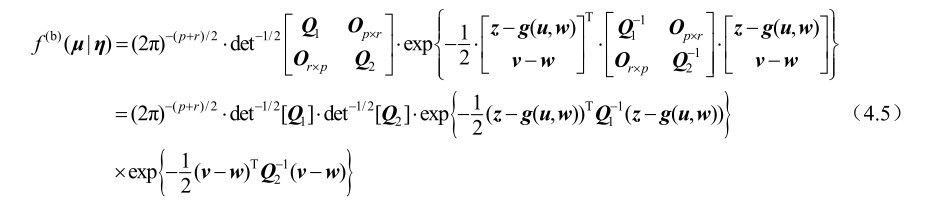 证明: 首先定义新的未知参量η=[u T w T ] T ∈R (q+r)×1 和新的观测向量 μ=[z T v T ] T ∈R (p+r)×1 。根据式(4.3)中的观测模型及其误差的统计假设可知,对于特定的参数η,观测向量μ的最大似然函数可以表示为