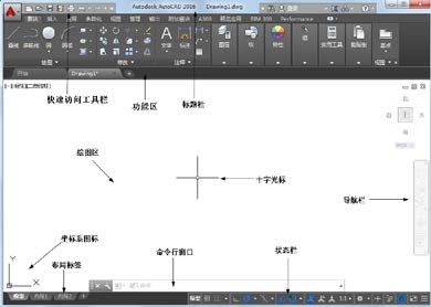 AutoCAD操作界面是AutoCAD显示、编辑图形的区域,一个完整的草图与注释操作界面如图1-4所示,包括标题栏、绘图区、十字光标、坐标系图标、命令行窗口、状态栏、布局标签和快速访问工具栏等。下面对其中的命令行窗口和状态栏进行重点说明。