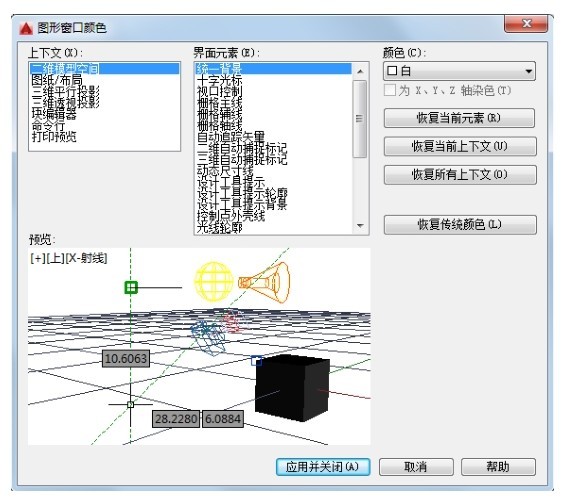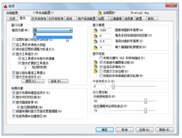 (1)在绘图窗口中选择“工具”菜单中的“选项”命令。屏幕上将弹出“选项”对话框。打开“显示”选项卡,如图1-9所示。单击“窗口元素”选项组中的“颜色”按钮,将打开如图1-10所示的“图形窗口颜色”对话框。