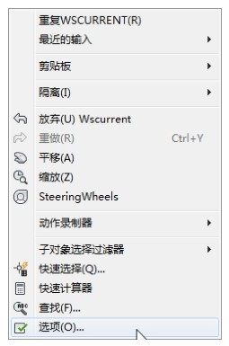 快捷菜单:选项(单击鼠标右键,系统打开快捷菜单,其中包括一些最常用的命令,如图1-8所示)