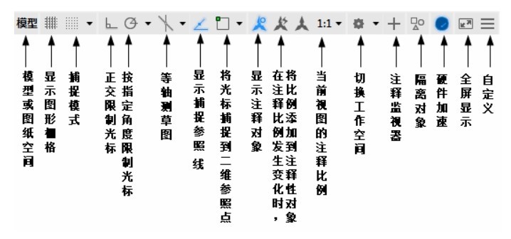默认情况下,不会显示所有工具,可以通过状态栏上最右侧的按钮,选择要从“自定义”菜单显示的工具。状态栏上显示的工具可能会发生变化,具体取决于当前的工作空间以及当前显示的是“模型”选项卡还是布局选项卡。下面对部分状态栏上的按钮做简单介绍,如图1-6所示。