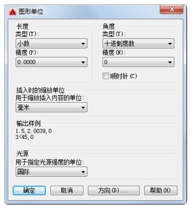 执行上述命令后,系统打开“图形单位”对话框,如图1-11所示,该对话框用于定义单位和角度格式。