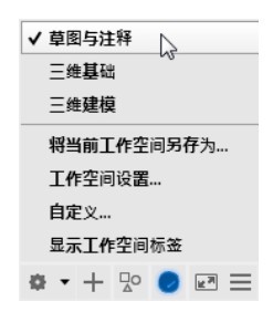 具体的转换方法是:单击界面右下角的“切换工作空间”按钮,打开“工作空间”下拉列表,从中选择“草图与注释”选项,系统将转换到草图与注释界面,如图1-5所示。