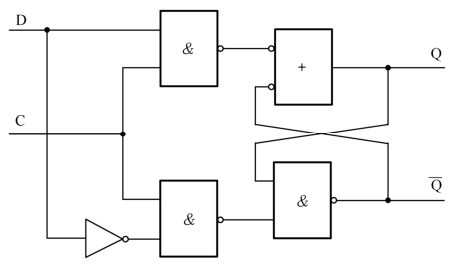 还是先看看图2.3的热闹,题目是:如何用门电路实现D锁存器(Latch)。至于什么是锁存器,包括关联的触发器什么的概念,《数字电子技术》里讲过。本书的后面也会介绍,这里读者看个结构,领会精神就好。