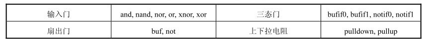 在表2.3里,输入门、扇出门应该是大家耳熟能详的。三态门大家也应该知道,即使不了解下文书讲到Verilog语言的值域时也会介绍。此外,pulldown、pullup分别为下拉、上拉电阻。在数字电路中,上拉电阻(Pull-up resistors)是当某输入端口未连接设备或处于高阻抗的情况下,一种用于保证输入信号为预期逻辑电平的电阻元件,通常在不同的逻辑器件之间工作,提供一定的电压信号。同样的,一个下拉电阻(Pull-down resistor)以类似的方式工作,不过是与地(GND)连接。它可以使逻辑信号保持在接近0伏特的状态,即使没有活动的设备连接在其引脚上。有关它们功能、用途等的详细介绍,可以参考网页:http://www.seattlerobotics.org/encoder/mar97/basics.html。