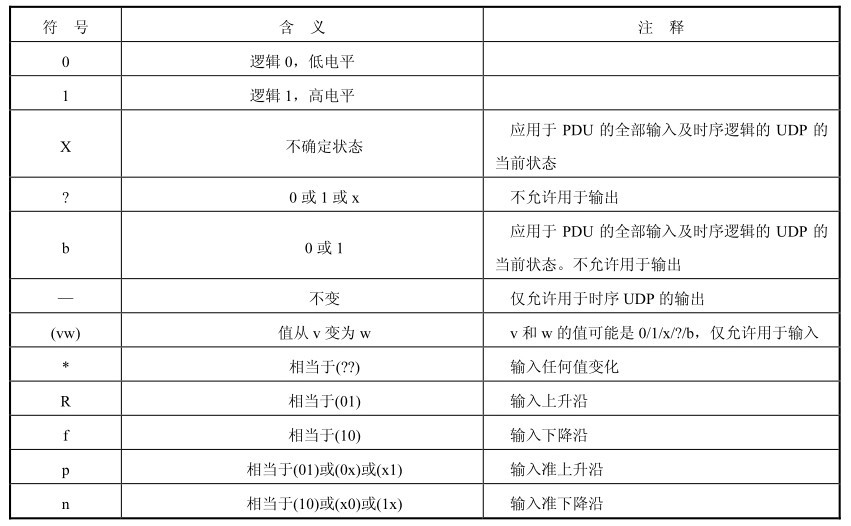 UDP里专用的关键词有table、endtable、primitive、endprimitive、r、f、p、n。其中,table /endtable 是查找表、真值表及激励表的“表”的开始和结束意思;primitive /endprimitive是原语的开始和结束;其他四个字母则是对数字信号沿的表示。其他有关内容还有Verilog的四个值域表示,这个后文书将会详细介绍。有关UDP模块内电平等的含义见表2.4(完全翻译的IEEE协议的有关内容,大家见笑了)。