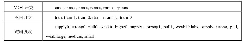 表2.3是与门级设计有关的Verilog关键词的一个总结,供大家参考(对于这些大家可尽管提问,吾将知无不言,言无不尽)。