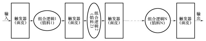 仅仅对于千层面这种食物而言,贫道觉得其口味是乏善可陈的,太油腻、太多奶酪,不适合鄙人的中国胃。但是大多数数字逻辑系统的结构,用千层面来做比喻倒是非常贴切的,尤其是混合多种馅的那种。单调一致的面皮是骨架,是时序单元——触发器;同时,内容丰富的馅料,是味道的融合,是各种组合逻辑单元。如图3.1所示,数字逻辑电路的结构基本都可以抽象为触发器之间夹着组合逻辑的模样。当面皮与馅料相遇,就会触发一段美好的味觉体验;当组合逻辑和时序单元结合,就会产生一个奇妙无比的系统。