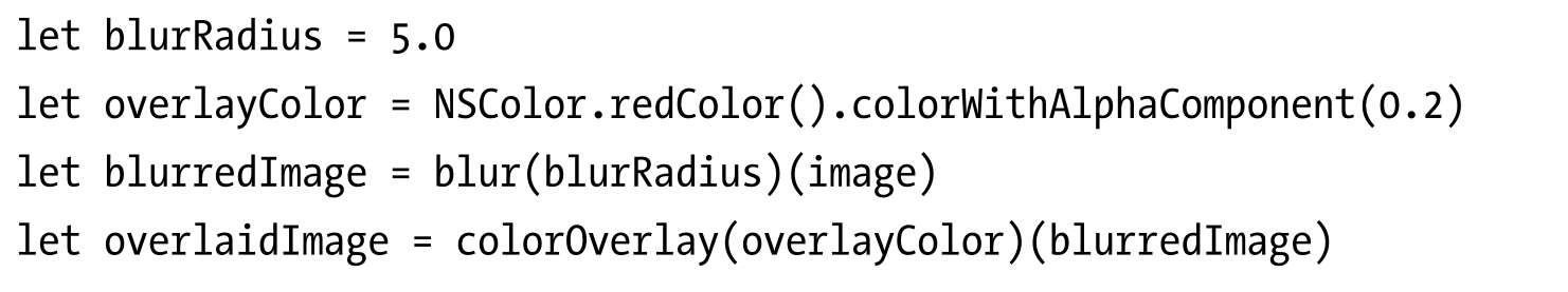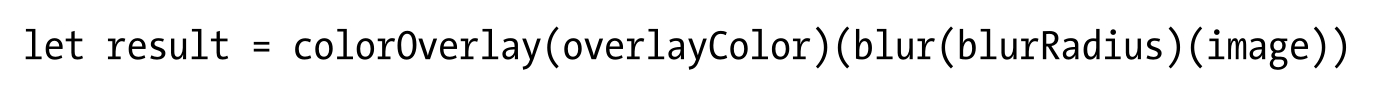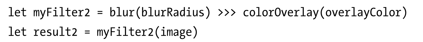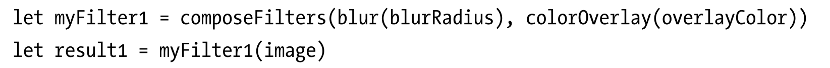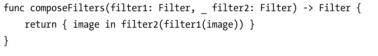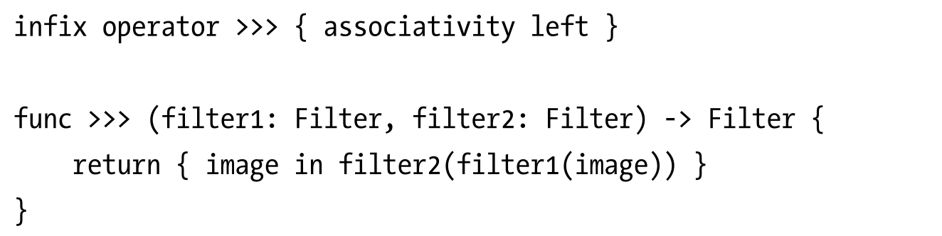 然而,由于括号错综复杂,这些代码很快失去了可读性。更好的解决方式是自定义一个运算符来组合滤镜。为了定义该运算符,首先我们要定义一个用于组合滤镜的函数: