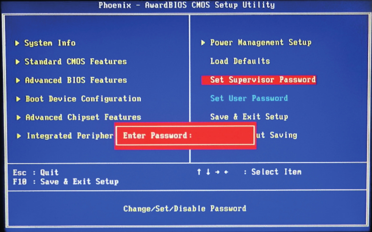 移动“当前项”到“Set Supervisor Password(设置超级管理员的密码)”并回车,在弹出的“Enter Password:(输入密码)”窗口中输入管理员密码并回车,并在随后弹出的“Re-Enter Password:(再次输入密码)”窗口中再次输入同一密码并回车,CMOS会将密码保存。