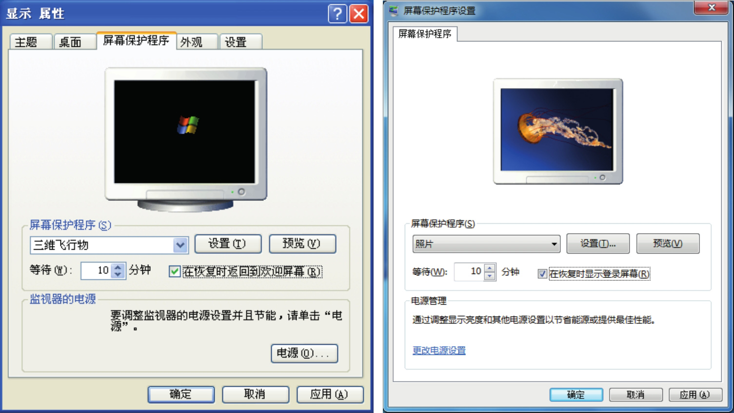 图3.4 设置带密码的屏幕保护项(左为Windows XP系统,右为Windows 7系统)