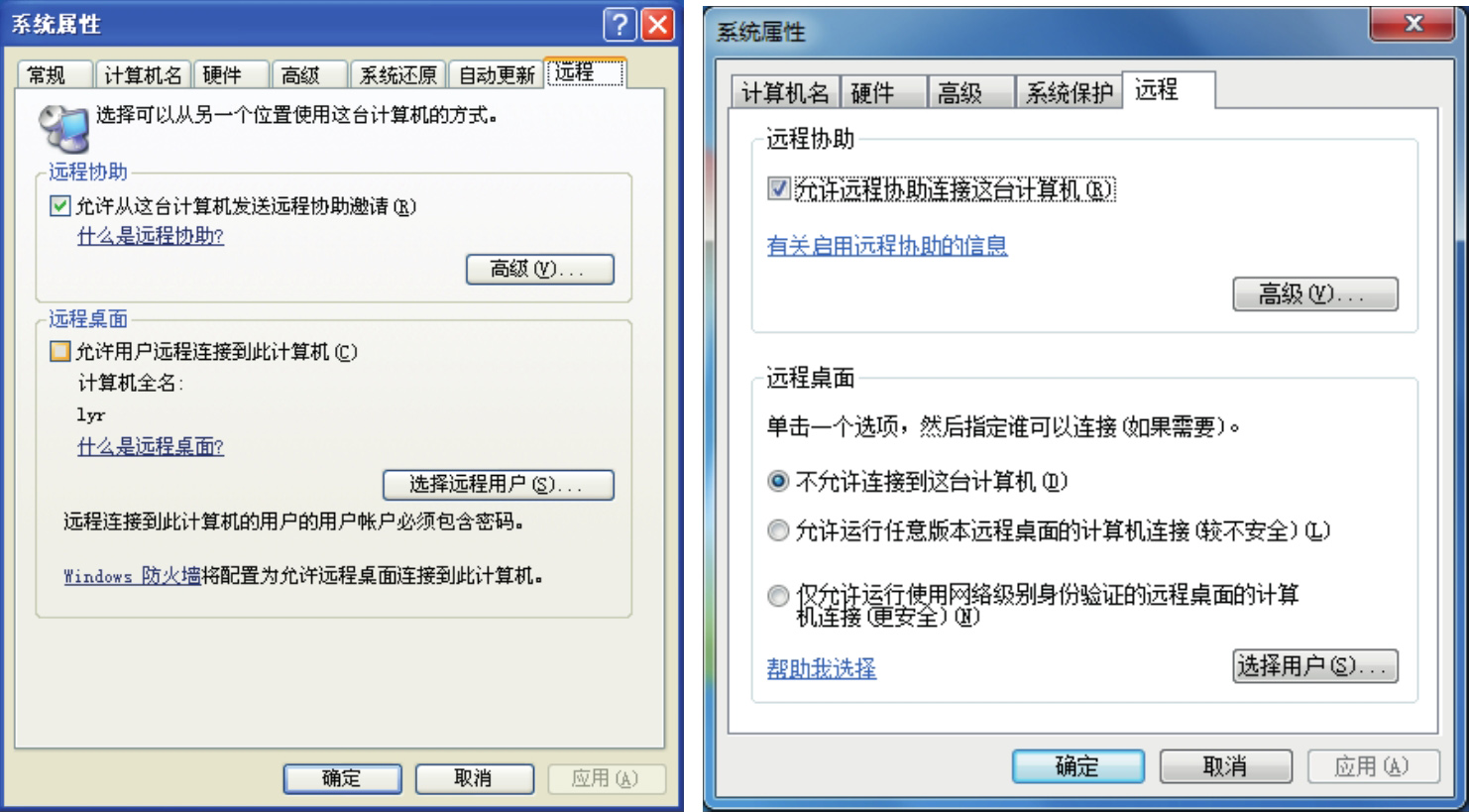 图3.5 远程协助的设置(左为Windows XP系统,右为Windows 7系统)