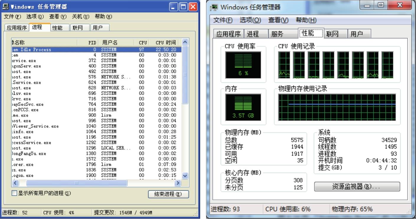 图3.9 通过任务管理器读取系统运行时间(左为Windows XP系统,右为Windows 7系统)