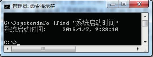 在Windows 7及以后的版本中,直接提供了一个“systeminfo”命令,在“命令提示符”中输入该命令,系统会显示包括系统启动时间在内的很多信息。不过,这里显示的时间是开机绝对时间,不是已运行的相对时间,如图3.10所示。