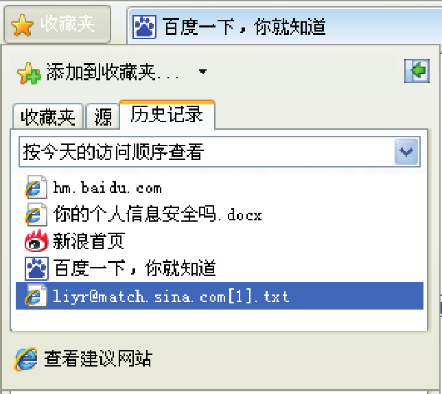 第二个保存较全文档访问记录的地址是IE浏览器中的“历史记录”,有趣的是,IE浏览器中的“历史记录”记录的不仅仅是该浏览器所打开过的文档列表,还包括一些不是由该浏览器打开,只不过这些文档的类型是该浏览器可以打开的那些文件,如图3.6所示。