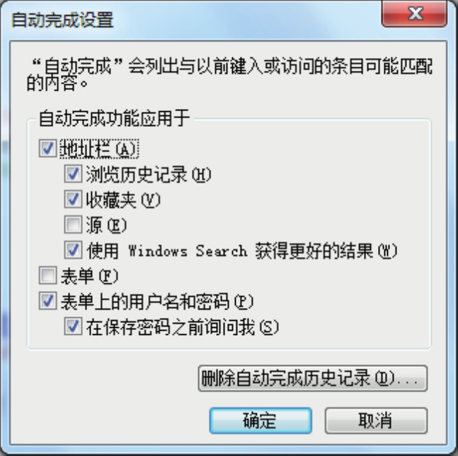 单击“自动完成”分组中的“设置”按钮,系统会弹出“自动完成设置”界面,这时,只需要单击复选框,选中要删除的项,单击“确定”按钮即可将相应的项删除,如图3.14所示。