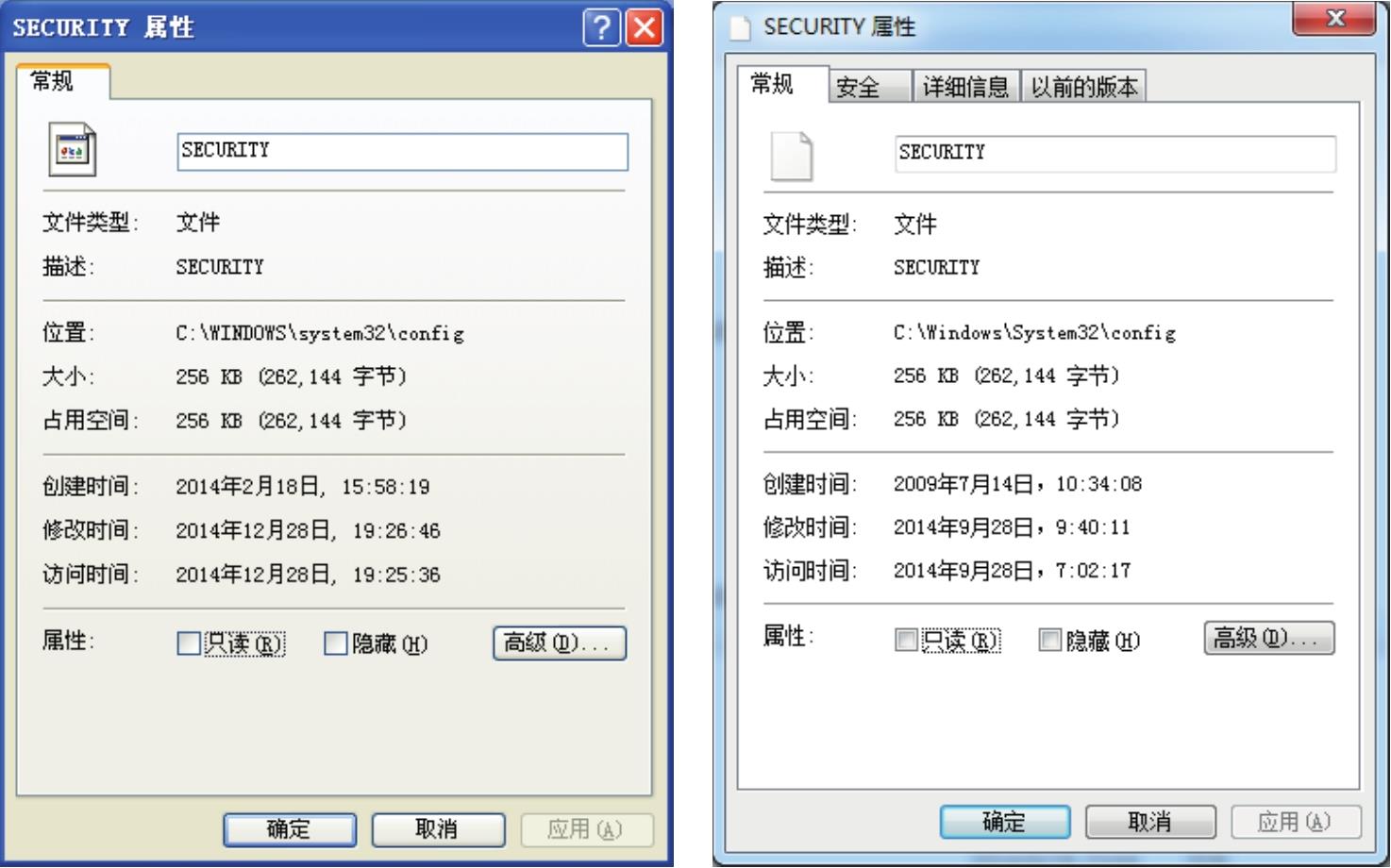 在Windows系统中,只要开机,必然会有很多的服务和程序启动,这些服务和程序大多数都有自己的日志记录,以便在出现异常时进行排查。不过,这些服务和程序或者不能保证在开机时必然写一次日志,或者是在系统运行期间不停地写入新的日志,因此难以帮助我们了解电脑什么时候开机。不过,有一个文件具有比较奇特的作用,该文件会在系统安装时被“创建”一次;在每次启动时被“修改”一次,系统在运行期间并不会被修改;在每次进行“读取”时被访问一次。因此该文件的内容仅从其日期来说便有独特的作用,这个文件就是“C:\WINDOWS\system32\config\SECURITY”。注意,该文件没有扩展名,如图3.7所示。
