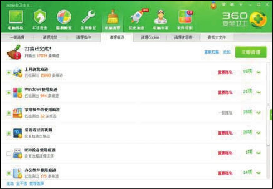 图3.11“360安全卫士”的“清理痕迹”选项卡操作实例