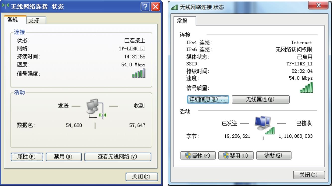 图3.8 查看无线网络的使用时间(左为Windows XP系统,右为Windows 7系统)