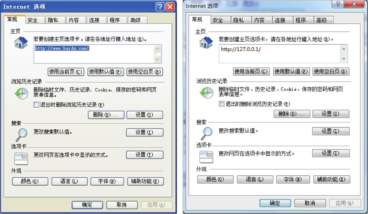图3.12 IE浏览器中的“Internet选项”界面(左为Windows XP系统,右为Windows 7系统)