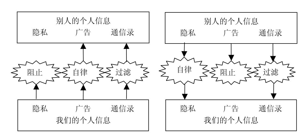 图1.1右图显示了别人的个人信息向我们发送时,我们应该采用的处理方式。对于别人的隐私类信息,我们应该通过自律的方式,尽可能地采用合适的方式保守秘密;而对于别人的广告类信息,我们则应该想办法阻止;对于通信录类信息,我们应按需接收。