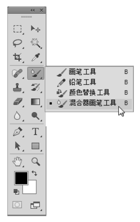 2 在工具箱中找到“混合器画笔工具”,如图1-59所示。如果仅使用鼠标绘制,在单击拖曳时,这个画笔会实时产生效果。如果使用专业的绘图板,Photoshop CS6能自动感知画笔状态,包括倾斜角度、压力等,并可在预览窗口中实时展现出来。