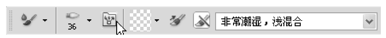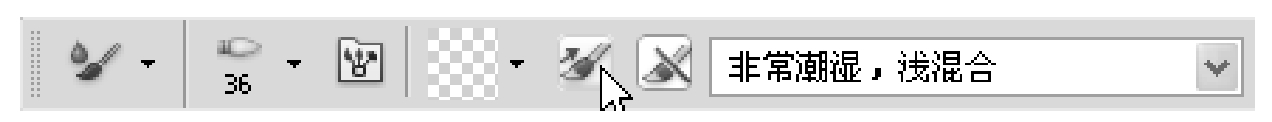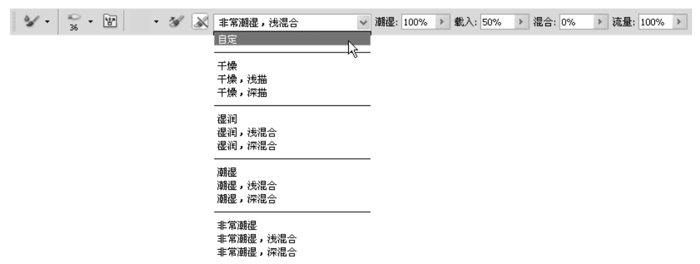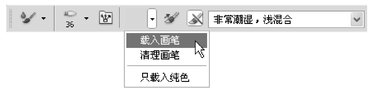 【潮湿】: 设置从画布拾取的油彩量。 【载入】: 设置画笔上的油彩量。