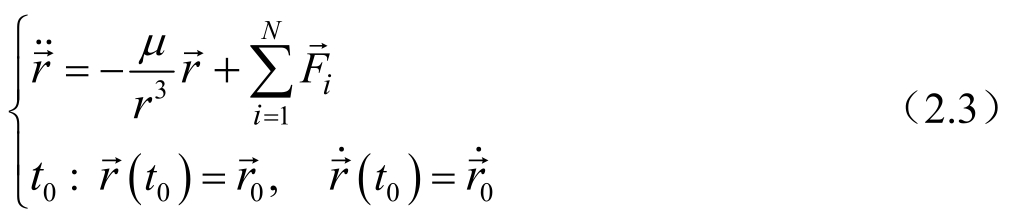 该模型对应的(n+1)体问题中,主要外力源作为中心天体,相应的质量记为M,坐标系原点取在其质心上,对于这样一个受摄二体模型,可归结为下列运动微分方程——常微初值问题,即