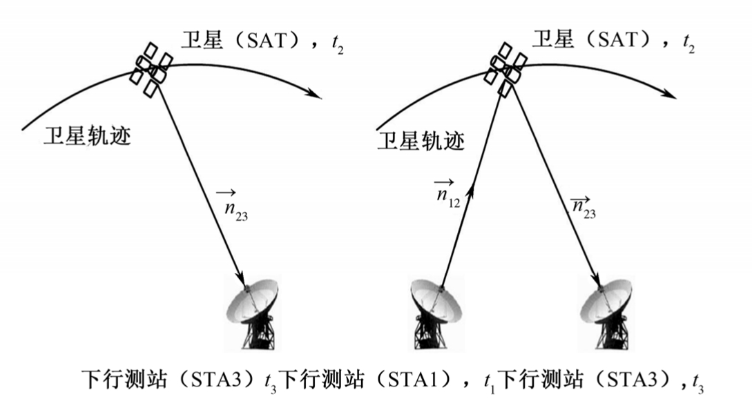根据通信系统的上行链路和下行链路的结构和类型可以将台站对航天器的跟踪划分为单程、双程和三程模式。单程模式是星载晶振产生下行信号,由地面台站接收跟踪信号,这种模式只有下行链路;双程模式是由地面台站向探测器发射上行信号,星上转发器接收上行信号,并产生一个相干的下行信号,由地面台站接收;三程模式与双程模式相类似,只是双程上行发射站与下行接收站相同,而三程的接收站与发射站不同。这三种模式中,双程模式是一种闭环跟踪模式,而单程和三程模式是开环跟踪模式,其通信链路两端开放 [4] 。图3.1为单程与三程跟踪模式示意图。在三程测量模式下,上行站与下行站之间的钟差将直接引入测量中,因此站间时间的同步是测控实施中需要解决的一个重要问题。