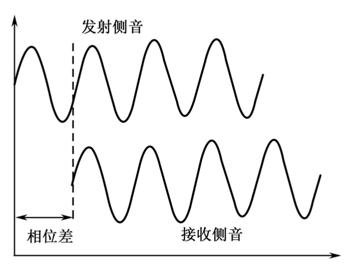 侧音测距是指从地面测站发射一组纯音信号(通常为正弦波),依次对上行载波进行调相,经上行调制后的纯音分布在载波的两侧,将其发射至航天器。星载应答机将接收到的上行侧音信号转发回地面测站。地面测站对接收到的信号进行调相解调恢复出侧音信号后,通过比较上行侧音信号与恢复出来的侧音信号之间的相位差,可计算出反映航天器与地面测站的距离信息。图3.2为测音测距原理示意图。侧音测距具有测距精度高、捕获时间短和设备简单的优点,其缺点是需要多次进行模糊度解算,因而侧音测距通常应用于近地航天器的测轨跟踪。