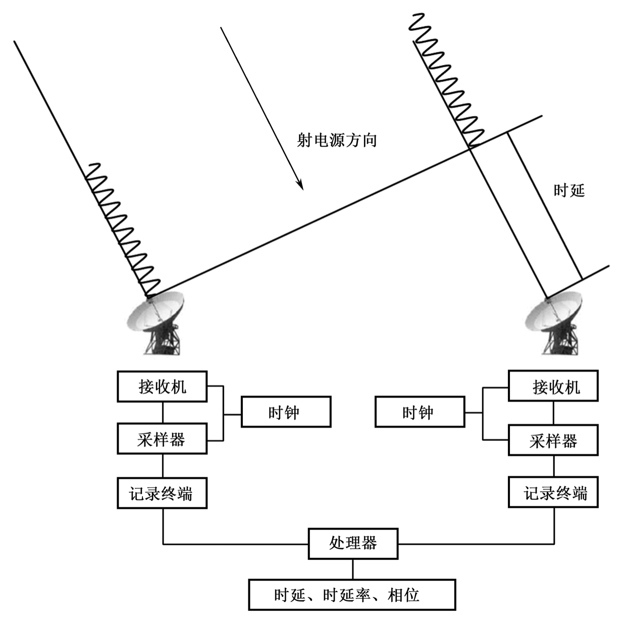 ⅤLBⅠ测量的基本原理:两个射电望远镜同时接收同一电磁波源发出的电磁波,对记录的数据通过相关处理得到此电磁波到达两个望远镜的相位差,从相位差中求出到达两个观测站的时间差(简称时延)。