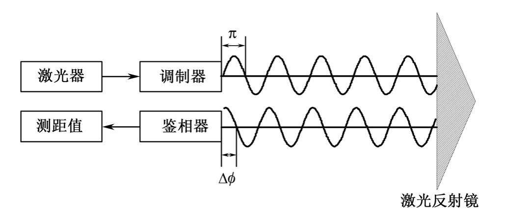 图3.4为相位激光测距的基本原理图,本质是测量激光发射与接收时刻的相位差,再通过波长将相差转换为距离,最后结合模糊度,获取激光往返的距离。相位式激光测距仪一般应用在精密测距中,其精度一般可达毫米量级。