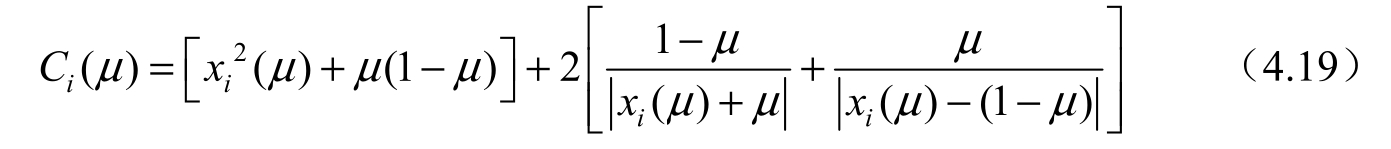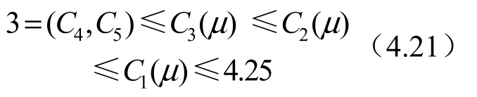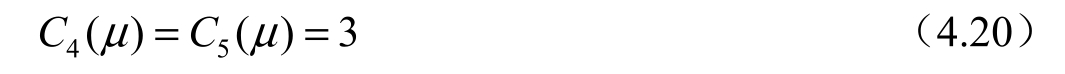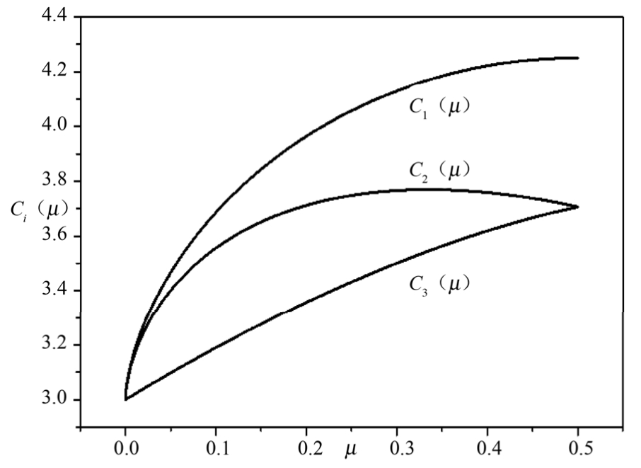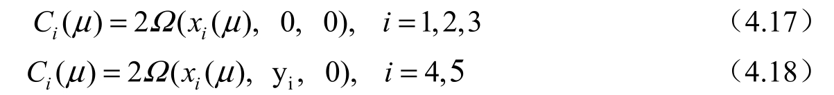 由式(4.19)、式(4.20)和x i (μ)与μ值的关系可知,5 个平动点处对应的 Jacobi 积分常数值C i (μ)的关系为