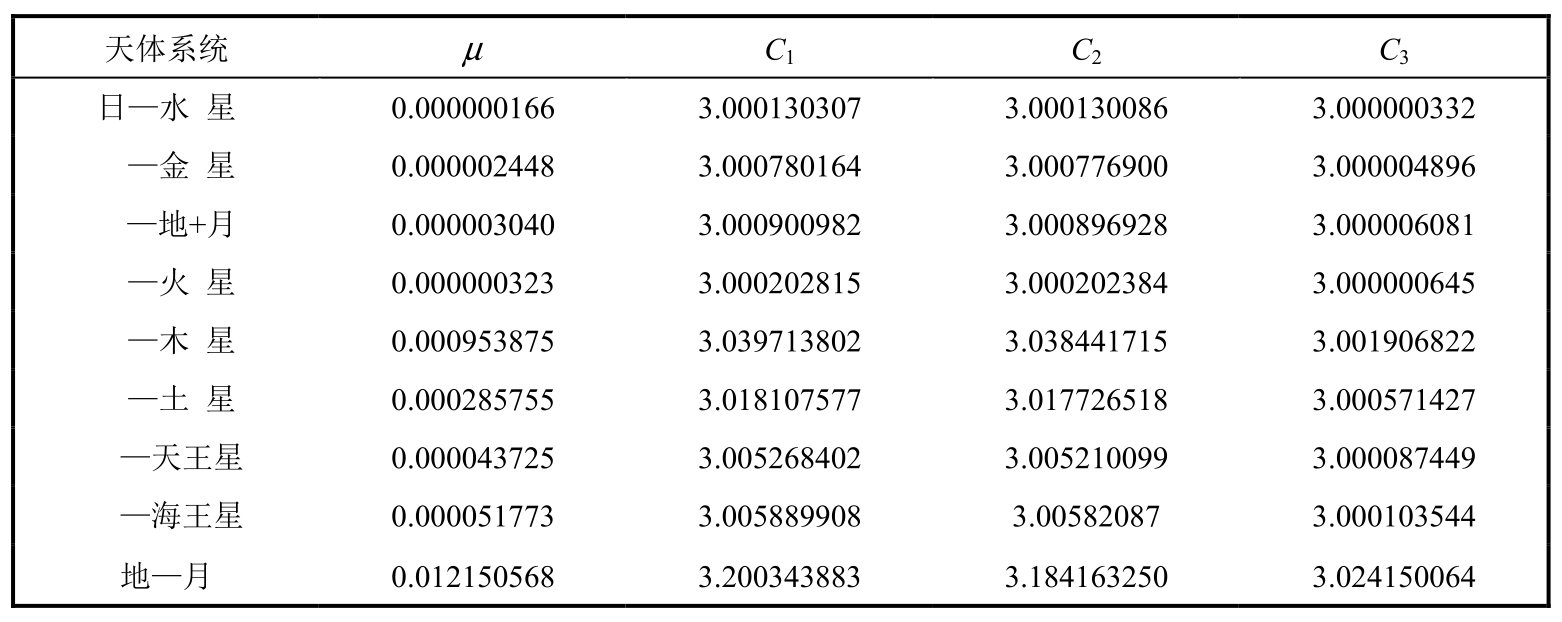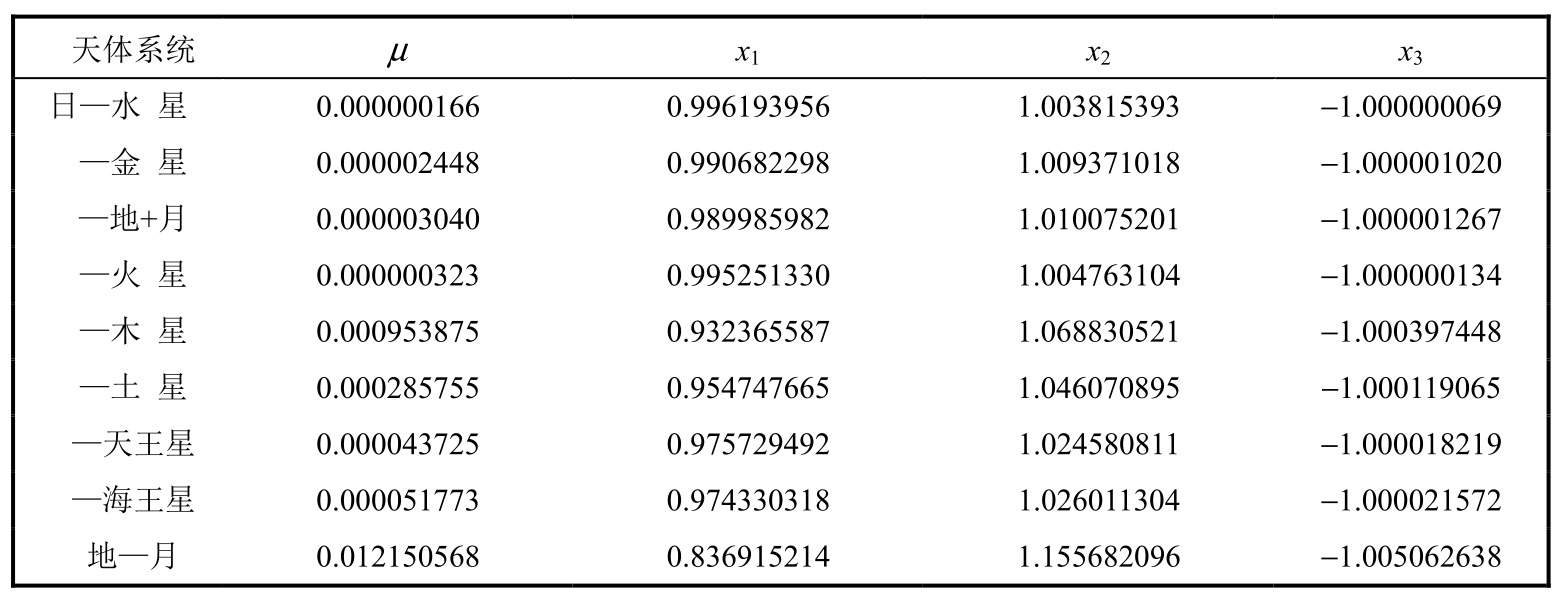 太阳—行星系统和地—月系统对应的圆型限制性三体问题,三个共线平动点的位置x i (μ)及其相应的 Jacobi 常数C i (μ),如表 4.1和表4.2所示。
