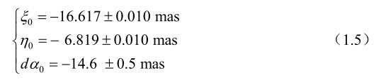 这里特别要说明一点:考虑到参考系的延续性,ICRS的坐标轴与FK5参考系在J2000.0历元需尽量地保持接近。ICRS的基本平面由VLBI观测确定,它的极与动力学参考系的极之间的偏差大约为20 mas,导致这个偏差的原因比较复杂。ICRS和FK5 参考系(J2000.0平赤道参考系)的关系由三个参数决定,分别是天极的偏差ξ 0 和η 0 ,以及经度零点差dα 0 ,它们的值分别为
