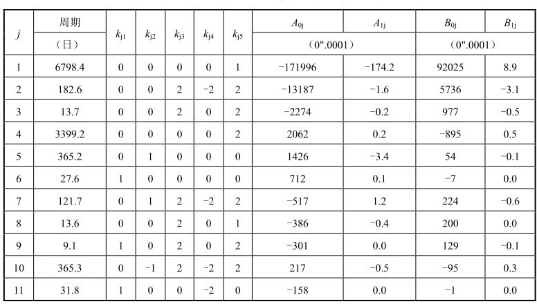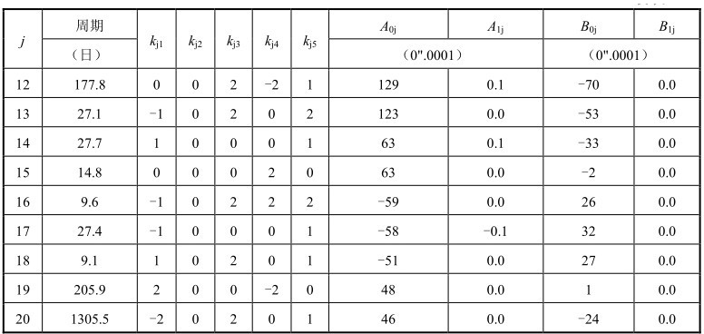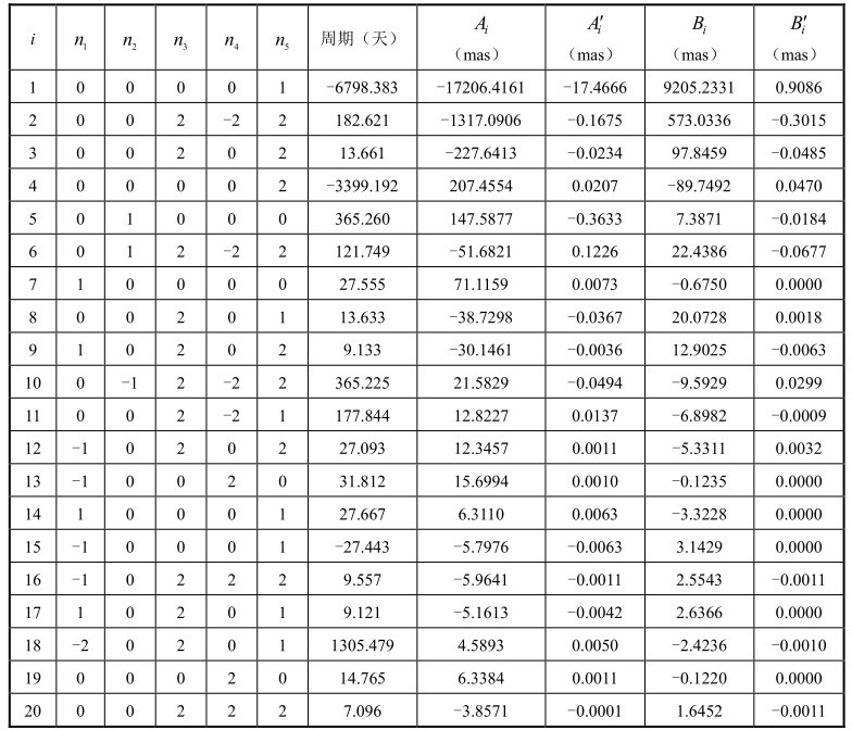 为了比较,对应IAU1980章动序列的前20项系数,同样列出IAU2000B章动模型前20项系数