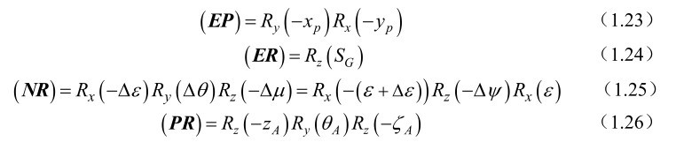这里的(PR),(NR),(ER)和(EP)是岁差、章动、地球自转和极移矩阵,分别由下列各式表达,即