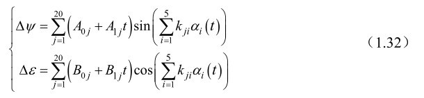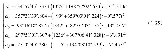 式(1.32)中,章动序列涉及的与太阳和月球位置有关的5个基本幅角α i (i=1,…,5)的计算公式为