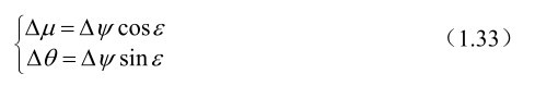 其中Δ μ=Δ Ψ cos ε A ,Δ θ=Δ Ψ sin ε A 是赤经和赤纬章动,Δ Ψ是黄经章动,Δ ε是交角章动,ε A 为瞬时平赤道面与黄道面的交角,称为平黄赤交角,计算公式为