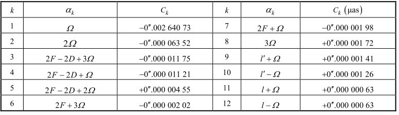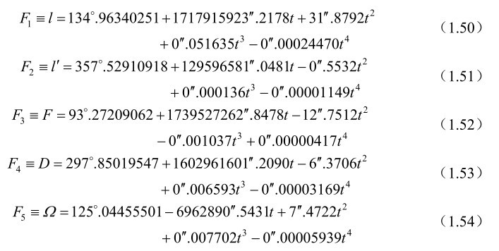 这 5 个与太阳、月球位置有关的基本幅角F k (k=1,…,5),分别为月球的平近点角、太阳的平近点角、月球的平升交点角距、日月平角距和月球轨道升交点平黄经。这5个基本幅角F k (k=1,…,5)就是前面IAU1980章动序列中出现的5个基本幅角α i (i=1,…,5),见式(1.35)。