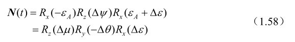 其中N(t),P(t)和B分别为章动、岁差和参考架偏差矩阵,其中参考架偏差矩阵B已在前面有过说明,它是一个旋转量很小的常数矩阵,在直接引用J2000.0平赤道坐标系作为地心天球坐标系时,就作为单位阵略去,不再考虑,如有特殊需要,考虑它也极其简单,见式(1.6)。于是有