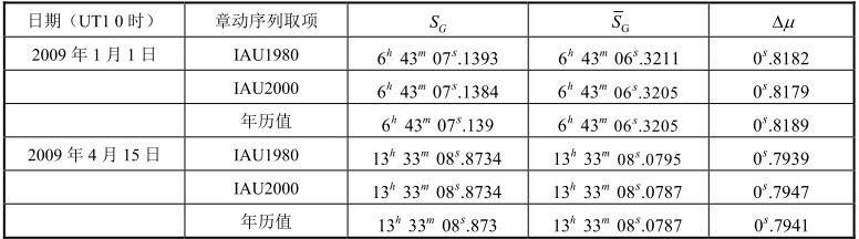 分别采用老规范(IAU1980)和新规范(IAU2000)计算进行比较,计算世界时2009年1月1日0时和4月15日0时(UT1,分别对应的简约儒略日为MJD=54832.0,54936.0)的格林尼治真恒星时S