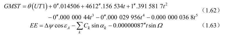 式(1.23)中的x p ,y p 是极移分量;式(1.24)中的格林尼治恒星时S G 由式(1.27)计算得