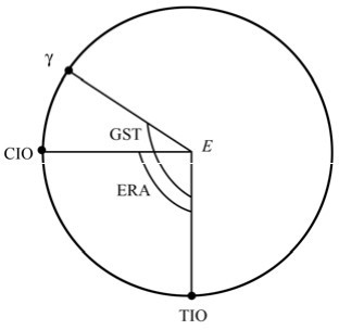 在天球参考系中观察时,中间赤道与 CIO 固结,称为天球中间赤道,地球中间零点TIO 沿赤道逆时针方向运动,周期为1 恒星日。在地球参考系中观察时,中间赤道与TIO 固结,称为地球中间赤道,天球中间零点CIO 以同样周期沿赤道顺时针方向运动。这两种观察所反映的都是地球绕轴的自转运动,CIO 和 TIO 之间的夹角是地球自转角度的度量,称为地球自转角 ERA(Earth Rotating Angle)。格林尼治真恒星时GST与地球自转角ERA有严格区别,在此前提下,矩阵R(t)的计算公式变为