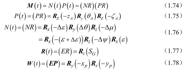 M(t)是岁差、章动矩阵,R(t)是地球自转矩阵,W(t)是极移矩阵。