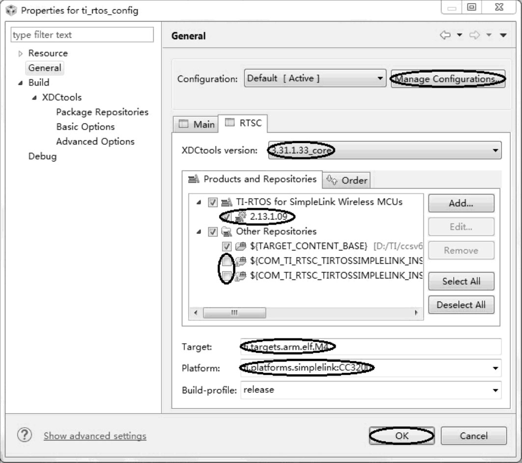 (5)重建ti_rtos_config项目时,除在“属性”对话框“main”标签选择“Compiler version”(编译器版本)为“TI v5.2.2”外,还需要在“RTSC”标签选择最新XDCtools和TI-RTOS版本,不选择bios和uia,确认“Target”(目标)是“ti.targets.arm.elf.M4”,选择“Platform”(平台)为“ti.platforms.simplelink:CC3200”,如图2.22所示。
